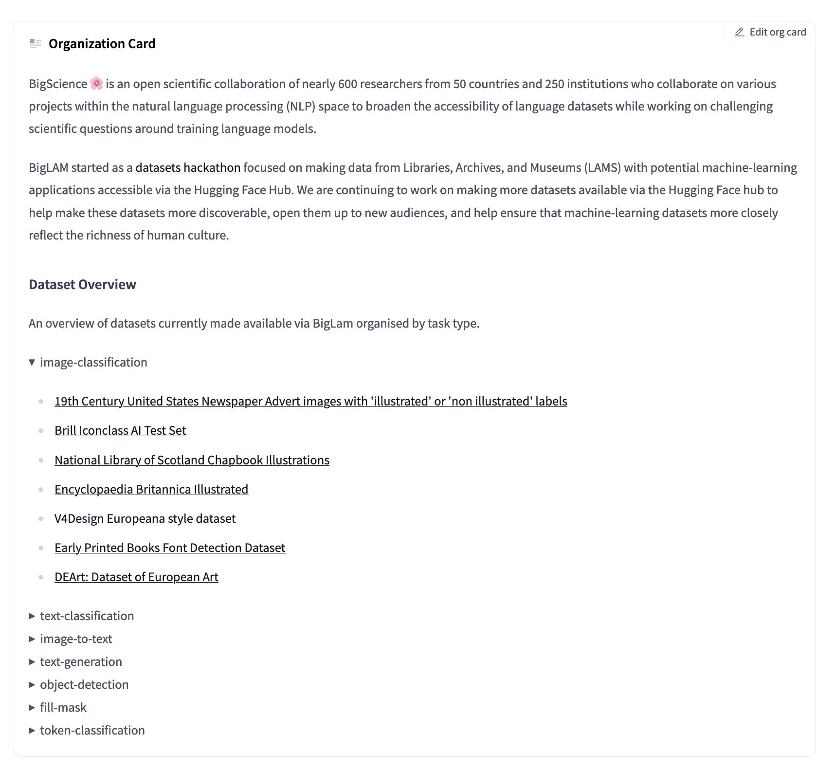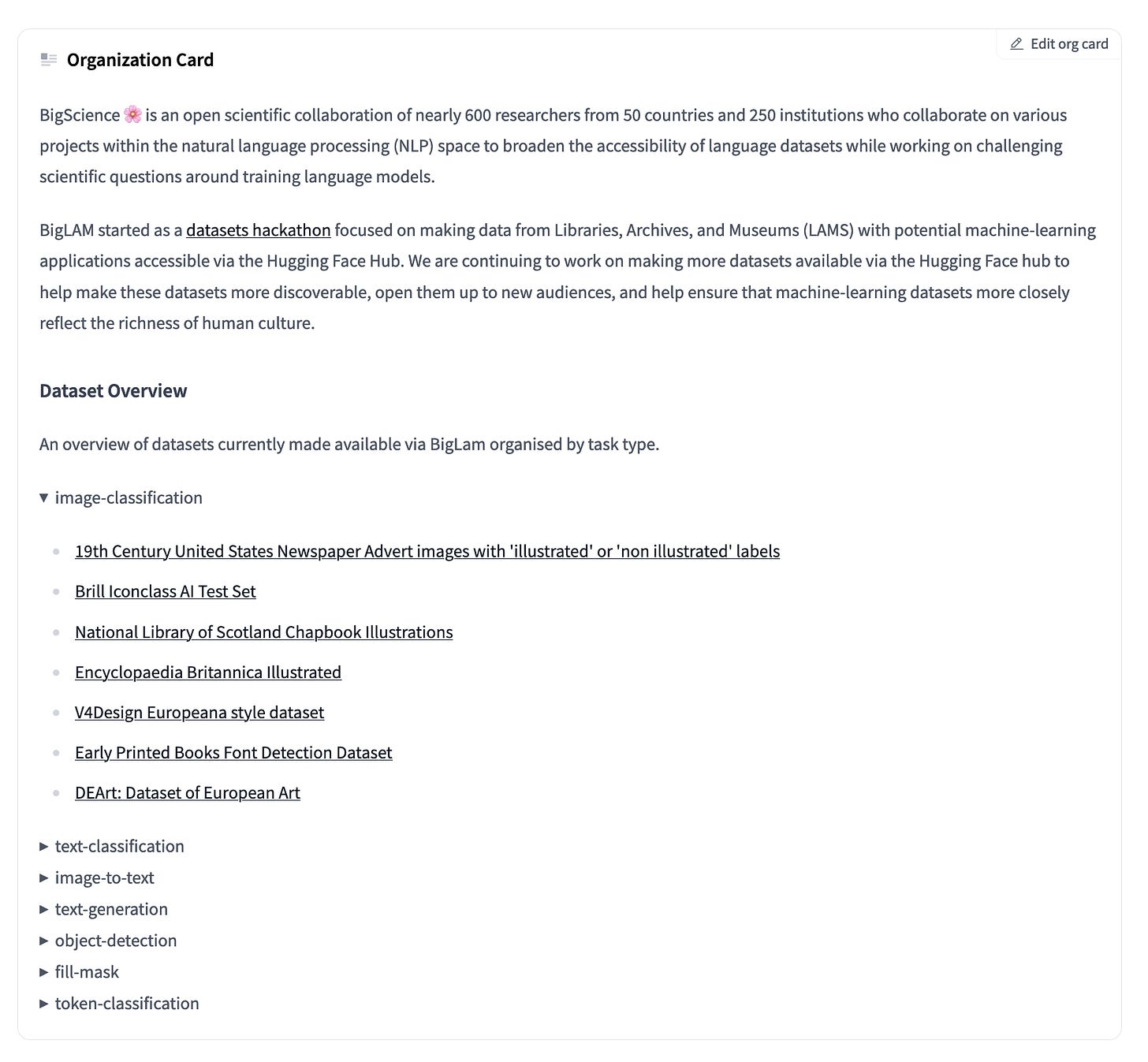 Whilst you can manually create this there might be some content that would be nice to auto populate. For example, for the BigLAM organization, we’re mainly focused on collecting datasets. Since we have many tasks supported by these datasets we might want to create a list of datasets organized by task. Ideally we don’t want to have to manually update this. Let’s see how we can do this!