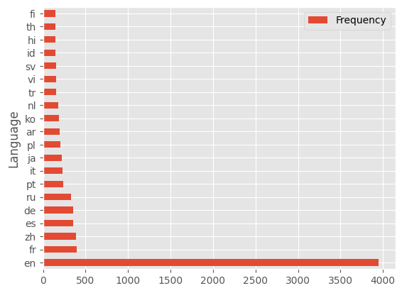 dfLanguage Frequency 0 en 3949 1 ja 221 2 ace 19 3 acm 6 4 acq 5 ... ... ... 1714 mr- 1 1715 xx 1 1716 nbl 2 1717 sep 1 1718 ssw 2