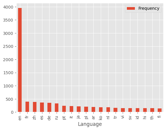 df.sort_values("Frequency", ascending=False).iloc[:20].set_index("Language").plot.bar()df["Percent"] = (df.Frequency / df.Frequency.sum() * 100).round(3)print(
