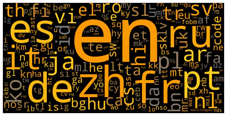 color_map = LinearSegmentedColormap.from_list("hugging_face", hugging_face_colors)wordcloud = WordCloud(width=800, height=400, colormap=color_map)