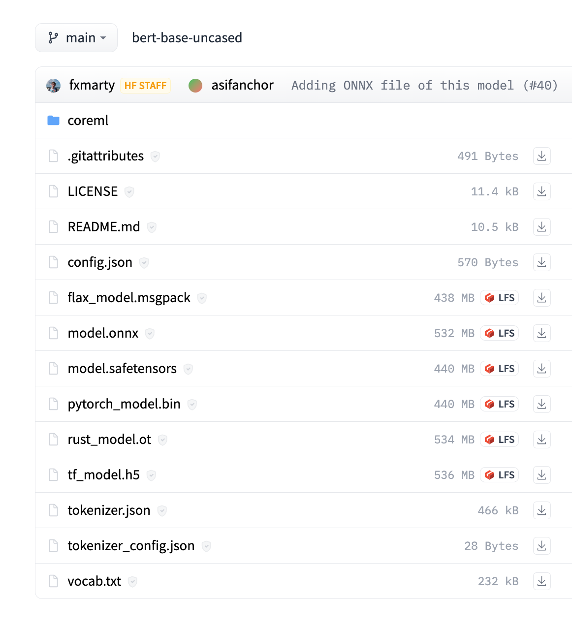 Let’s look at an example of a popular machine learning model to understand better what a ‘machine learning model’ can consist of. We'll see many files if we look at the files inside the model repository for the bert-base-uncased model on the Hugging Face Hub.